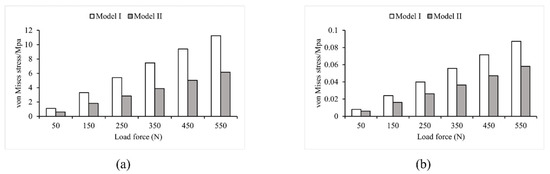 Von Mises stress values in Model I and Model II (a) maximum stress; (b) average stress.
