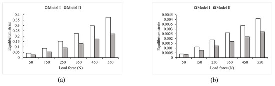 Loads ranging from 50 N to 550 N in 100 N increments were applied to two FE models that used different modeling methods. As shown in Figure 4 and Figure 5, the two models had noticeably different results in stress and strain. Comparing Model I and II, it was found that the maximum stress value in Model I was 1.7 times higher than that in Model II. Additionally, the average von Mises stress values in Model II were 34.86% lower than in Model I, except for the first step of the loading experiment, where the average stress did not change significantly (less than 7.3%). In the other five steps of the loading experiments, the average stress decreased significantly in Model II, ranging from 30.2% to 34.86%. Furthermore, the maximum strain value was significantly higher (1.7 times to 1.9 times) in Model I than in Model II. Conversely, the average strain decreased significantly in Model II, ranging from 24.86% to 34.76%.