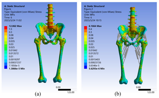 In this experiment, two FE models of the pelvis were presented to investigate how the surrounding soft tissues affect pelvic stress and strain. In Model I, no muscles or ligaments were added, and all joints were fixed to prevent deformations that would not converge in the force analysis during loading. In Model II, muscles and ligaments were included by replacing them with spring elements, and material parameters were determined using the biomechanical modeling approach proposed in this study. The sacroiliac and acetabular joints were allowed to move freely without friction, allowing flexion and extension movements. Both models were placed in identical boundary conditions to simulate a person’s natural standing position. The femur bones were fixed the vertebrae were constrained to have only vertical displacement. A vertical force was applied downwards onto the top of the lumbar spine in the model. The loading conditions were consistent between the two models, with a range of 50 N to 550 N applied in five loading steps, each with an interval of 100 N. The pelvic model comes from a healthy Chinese volunteer’s CT (female, age 43, height 162, weight 48) and then reconstructed by MIMICS 20.0 and Geomagic 2017 software. All the FE experiments were conducted in FE software ANSYS 17.0.