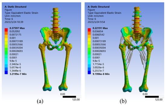 Cadaveric experiments often differ from actual biomechanical conditions of a living body because muscles, ligaments, and other surrounding soft tissues that have been rendered severely inactive on the surface of the pelvis are typically removed beforehand. Therefore, it is reasonable to expect lower strain values from the FE model loading experiment than from cadaveric experiments. The significant correlation between the FE analysis results of Model II and Hao’s cadaveric experimental results [42] confirms the model’s accuracy.