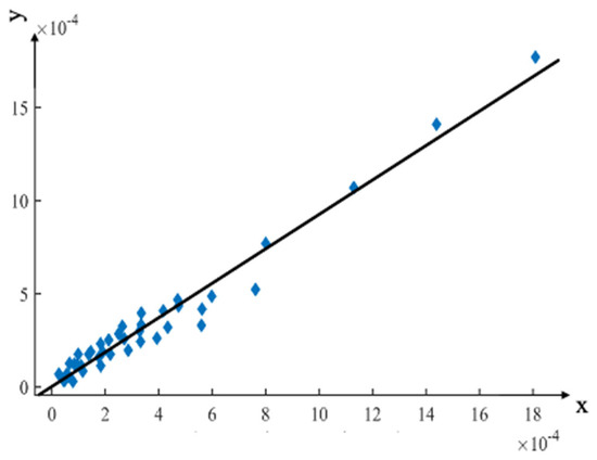 The regression equation and correlation coefficients can be determined using the cadaveric experimental data as the independent variable and the FE model loading experimental data as the dependent variable, as shown in Equation (5). Figure 8 shows the linear regression analyses and the distribution of experimental results.