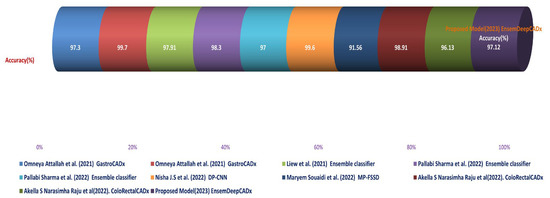 - Omneya Attallah et al. (2021) [17] obtained an accuracy of 97.3% and 99.7% on the Kvasir2 and Hyper Kvasir datasets, respectively, using the GastroCADx method with AlexNet, DarkNet19, ResNet50, DenseNet-201, DWT, DCT, and SVM. The duration of execution for both datasets was three hours;