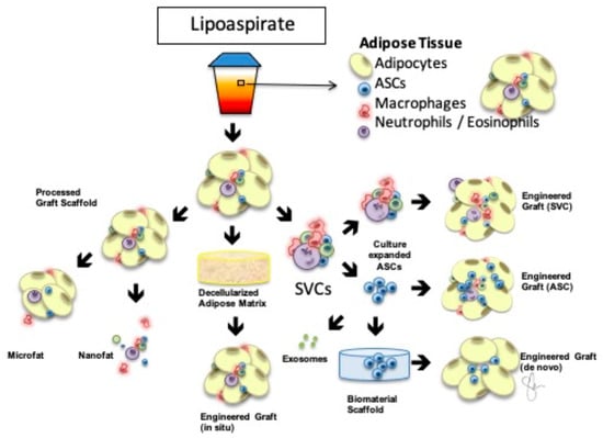 Engineered AdipoSe Therapeutics in Regeneration (EASTR) Concept Adipose-based therapeutics in regenerative medicine begin with processed lipoaspirate. Adipose tissue contains multiple stromal vascular fraction cells (SVCs) illustrated in the upper right, and the resulting graft is a natural tissue scaffold that can be further deconstructed for ultra-purified grafting as in microfat or nanofat or supplemented with additional cells including SVCs or a pure population of adipose-derived stem cells (ASCs). Culture-expanded ASCs could be encapsulated in a biocompatible, biomaterial scaffold for de novo engineered grafts or used to develop exosomes based on their paracrine effect, removing the cellular component out of the construct. Finally, decellularized adipose matrix can be delivered as an off-the-shelf allograft for in situ grafting without the additional donor site. Modified with permission [].