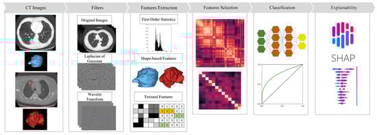 Radiomic features provide information about both the grey-level patterns and inter-pixel relationships in medical images; spectral and shape properties can be extracted from the regions of interest as well. These features can then be used to create computational models based on machine learning techniques, which can aid in the diagnosis, prognosis, and treatment guidance of various medical conditions [,,]. Certain radiomic features have even been found to identify genetic alterations in tumor DNA, which has resulted in the development of the field of radiogenomics [], which strives to find correlations between image features and characteristics of the genome of the patient. Such a process aims to unveil the dynamics involved at the genetic and molecular levels through medical image analysis. Indeed, computational techniques to extract quantitative features from those images can be linked to distinctive characteristics of the phenotype and genotype of the tissue. Radiomics has garnered significant attention in the context of lung cancer screenings with the aim of enhancing diagnostic sensitivity and specificity while reducing the time burden placed on radiologists. Additionally, radiomics is being utilized in precision medicine to forecast prognosis and the efficacy of specific therapies [].