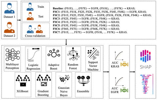 The aim of this study was to classify the mutational status of KRAS and EGFR comparing several machine learning classifiers trained on radiomic features extracted from CT images. To do this, we employed Logistic Regression (LR), Support Vector Machines (SVM), Adaptive Boosting (AB), Random Forest (RF), Multi-layer Perceptron (MLP), XGBoost (XGB), Gradient Boost Model (GBM), Gaussian Naive Bayes (GNB), and an ensemble (ENS) of all these models, which was implemented using a soft voting classifier. These models were selected due to their wide use in radiomic studies for medical classification purposes [,,,]. The models’ performances were evaluated on the AUC computed on the validation set. Figure 2 depicts the workflow employed in this study for training the classification models.