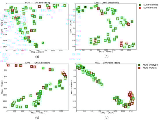 t-SNE and UMAP were obtained considering the FSC2, which resulted in the best AUC values for predicting the mutational status of EGFR and KRAS. (a,b) show t-SNE and UMAP visualizations for EGFR, respectively. (c,d) show t-SNE and UMAP visualizations for KRAS, respectively.