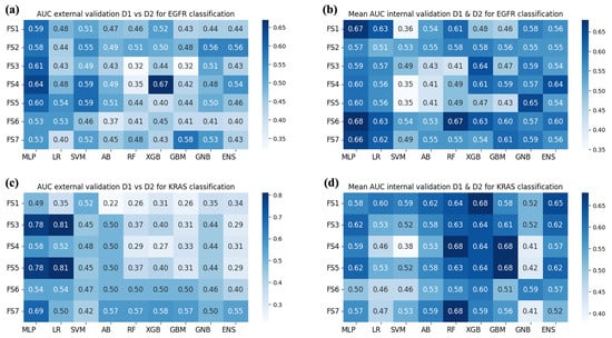 Experiment 2, instead, aimed to evaluate the performance of the models when D1 and D2 were merged. However, AUCs obtained via internal cross-validation were inferior compared to those of Experiment 1. The results obtained for predicting the mutational status of EGFR and KRAS in this experiment are presented in Figure 4b,d, respectively, for what concerns FS. In the case of FSC, results are displayed in Figure 5b,d for EGFR and KRAS, respectively. The ENS model achieved an AUC value of 0.71 for predicting the mutational status of EGFR, exploiting the FSC1. Among single models, the GNB achieved an AUC of 0.70 with the FSC7. On the other hand, for what concerns KRAS, different combinations of feature sets and feature set collections for RF, XGB, GBM managed to achieve an AUC of 0.68.