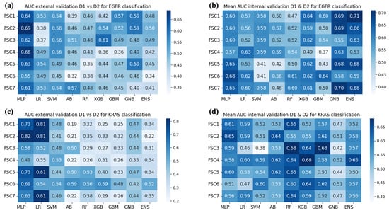 AUC obtained by the classification models used for each considered FSC. (a) Results of Experiment 1—EGFR mutation. (b) Results of Experiment 2—EGFR mutation. (c) Results of Experiment 1—KRAS mutation. (d) Results of Experiment 2—KRAS mutation.