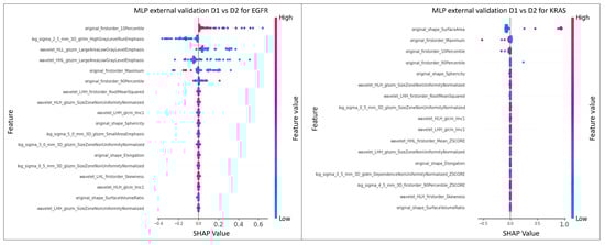 The MLP model with a hidden layer of 20 neurons achieved the highest AUC value of 0.69 in the prediction of the mutational status of EGFR. For KRAS, the top-performing model was MLP, with a hidden layer of 10 neurons with an AUC value of 0.82. In both cases, MLP obtained the best result by exploiting the FSC2. The SHAP analysis was conducted on the top model with the highest AUC values in predicting the mutational status of both EGFR and KRAS.