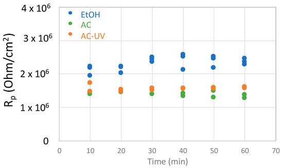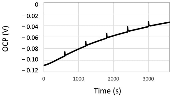 - During the OCP measurement, linear polarization measurements were carried out every 10 min from −10 mV to +10 mV with respect to the OCP at a scan rate of 2 mV/s in order to determine the polarization resistance (Rp). Rp is inversely proportional to the corrosion rate.