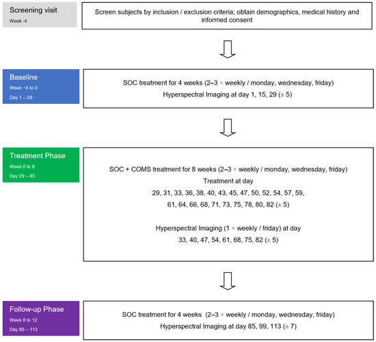 Hyperspectral images were collected as a surrogate endpoint to analyze the effects of COMS treatment on wound-healing-related parameters such as tissue oxygenation and tissue water index (Figure 2). HSI measurements were collected during baseline, treatment, and follow-up phase. Measurements were performed during patient visits before and after COMS treatment as an adjunctive to Standard of Care (SOC). During the study period, the standard of care (SOC) for wound treatment was based on the recommendations of the Association for Wound Care (SAWC) but was individualized as deemed necessary by the treating physicians. The SOC comprised wound cleansing, debridement, exudate management, maintaining an appropriate level of moisture for the wound, and addressing infection and inflammation. The use of any other advanced wound care products was not permitted. Additionally, addressing the vascular cause of the wound, such as using compression therapy, was considered SOC and was continuously addressed throughout the study.