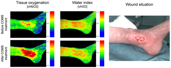 In conclusion, while uncovering limitations in comparing wound-healing-related parameters assessed through hyperspectral images over extended periods of time, this study demonstrated its use to investigate short-term changes in wound-healing-related parameters over longer treatment durations. This exploratory sub study demonstrated positive short-term effects of COMS therapy as an adjunctive treatment to standards of care on modulation of inflammation and increase in tissue perfusion in chronic wounds of various etiologies. These are important observations that help to shed light on the underlying physiological conditions required to set the foundation for efficient phase transition towards the healing of wounds that tend to stay in the inflammatory phase. In addition, the results of this study add to a growing body of evidence, confirming the safety and efficacy of COMS therapy as a new treatment option for patients with chronic wounds, particularly those who did not respond to standard of care (SOC) treatment.