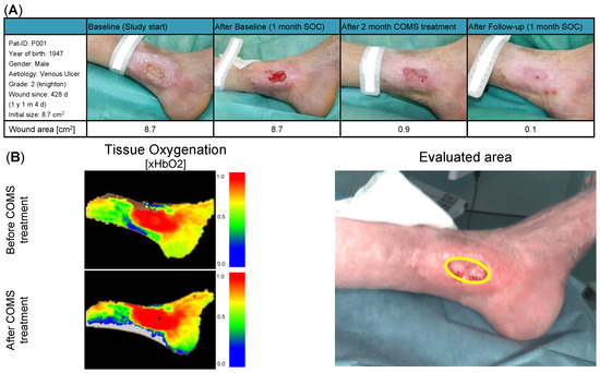 (A) Patient description and demographic: Patient P001 presented with a grade two venous leg ulcer according to Knighton, which had been present on the medial left ankle for 428 days at the start of the study. During the baseline period, the patient did not show a significant reduction in the wound area, indicating non-responsiveness to standard of care (SOC) treatment. During COMS treatment, the wound area was markedly reduced to 0.9 cm2, with the wound achieving a near-complete closure (0.1 cm2) at day 113. (B) Short-term changes in tissue perfusion: Case example patient 001. Visualization of changes in tissue oxygenation (xHbO2) before and after COMS therapy, measuring deep blood flow and oxygenation of hemoglobin.