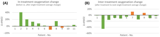 Considering all performed measurements before and after COMS therapy, an overall increase in tissue oxygenation was found in 9 out of 11 patients (Figure 5). However, it should be noted that patients seven and nine had an overall negative reaction, with a short-term reduction in oxygenation over all performed measurements of the treatment period. Patient seven seemed to have a different reaction to the therapy compared to other patients.