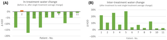 The results showed that there was a short-term effect in reducing tissue water within the wound and its environment in 10 out of 11 patients on average (Figure 7). This effect was accompanied by elevated levels of tissue secretion during the treatment sessions noted by the care givers. Only the wound of patient two had seen an increase in water content after the treatment. Nevertheless, patient two (a SOC responder) was already healed by 79% at therapy start and, subsequently, completely healed during the study period. Interestingly, when analyzing the changes in tissue water content in-between treatment visits, water levels accumulated in the days between treatments for all patients.