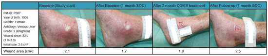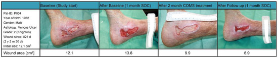 Patient 004 (Figure 8): The male patient, who was born in 1932 with a BMI of 20.7 kg/m2, had a complex medical history that included dilatative arteriopathy for almost a decade, chronic obstructive pneumopathy for eight years, and hypertensive coronary disease for four years. At the beginning of the study, the patient was presented with a venous leg ulcer (Knighton grade two) on his right ankle, which had been present for over two years (821 days) and had a wound area of 12.1 cm2. After receiving 29 days of baseline standard of care (SOC) treatment, he was classified as a SOC non-responder, with the wound area increasing to 13.6 cm2, prior to starting COMS treatment.
