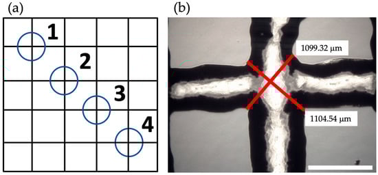 (a) Representation of a printed scaffold with four selected crossing points (adapted from Bednarzig et al. (2022) []). (b) Exemplary picture of a scaffold printed with ADA-GEL. Care was taken at the crossing point to ensure that the marked lines were always at right angles to each other. The shown lengths of the crossing lines were measured using the microscope. Scale bar = 1 mm.