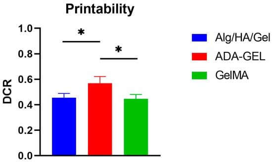 DCR of the three hydrogels Alg/HA/Gel, ADA-GEL, and GelMA directly after printing. Data represented as mean ± standard deviations. * p < 0.05.