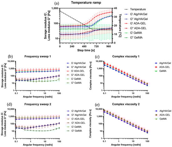 (a) Temperature ramps of the three measured hydrogels. From the initial temperature of 37 °C the inks were cooled to 15 °C, which was maintained for 6 min. Logarithmic representation of the left y-axis. (b) Frequency sweep 1 directly after the sample was cooled down to 15 °C. G′ represents storage modulus of the respective gel, and G″ the loss modulus. (c) Value of omplex viscosity 1, coinciding with frequency sweep 1. (d) Frequency sweep 2: 10 min after frequency sweep 1. G′ represents storage modulus of the respective gel, and G″ the loss modulus. (e) Value of complex viscosity 2, coinciding with frequency sweep 2. Double logarithmic plot of the axes at (b–e). Data represented as mean ± standard deviations.