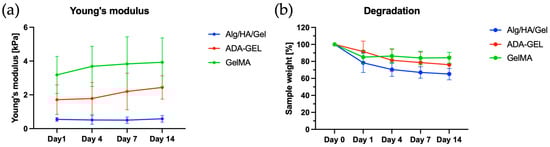 Comparing the samples prepared from Alg/HA/Gel with each other over the days, no significant differences in the Young’s moduli were observed (Table 1). Similarly, the measured Young’s moduli of the ADA-GEL samples over days 1 to 14 showed no statistically significant differences. The same could be detected for GelMA (Figure 5a). However, when comparing the inks with each other, statistically significant differences could be observed. For GelMA, a statistically significant higher Young’s modulus could be measured on day 1 than for the Alg/HA/Gel blend. Similarly, the Young’s modulus of Alg/HA/Gel was also statistically significantly lower than that of ADA-GEL. Moreover, on day 4, a statistically significant higher Young’s modulus could be measured for GelMA and ADA-GEL than for Alg/HA/Gel. On day 4, the Young’s modulus measured for GelMA was also statistically significantly higher than that for ADA-GEL. On day 7, the Young’s modulus of GelMA and ADA-GEL was statistically significantly higher than that of Alg/HA/Gel. On day 14, only a statistically significant higher value of GelMA could be measured compared with the Young’s modulus of Alg/HA/Gel. It appeared that GelMA was the stiffest gel, whereas Alg/HA/Gel was the softest. The Young’s modulus of ADA-GEL was between the values of GelMA and Alg/HA/Gel on all days considered.