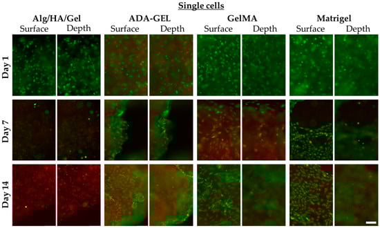 Single cells on days 1, 7, and 14 in Alg/HA/Gel, ADA-GEL, GelMA, and Matrigel on the surface of the scaffolds and at 100 μm depth. Green = live cells, red = dead cells; 10× magnification. Scale bar = 100 μm.