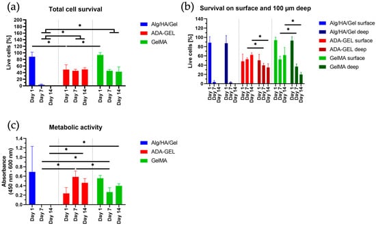 (a) Total cell survival in each bioink. (b) Proportion of live cells on the surface and live cells at 100 μm depth of the gels. (c) Metabolic activity of the single cells in the bioinks. Data represented as mean ± standard deviations. * p < 0.05.