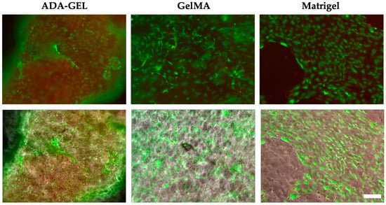 Example images of single cells at day 14, showing cell-cell contacts at the surface of the scaffolds in ADA-GEL, GelMA, and Matrigel. Upper image: live (green) and dead (red), lower image merges with phase contrast. Scale bar = 100 μm.