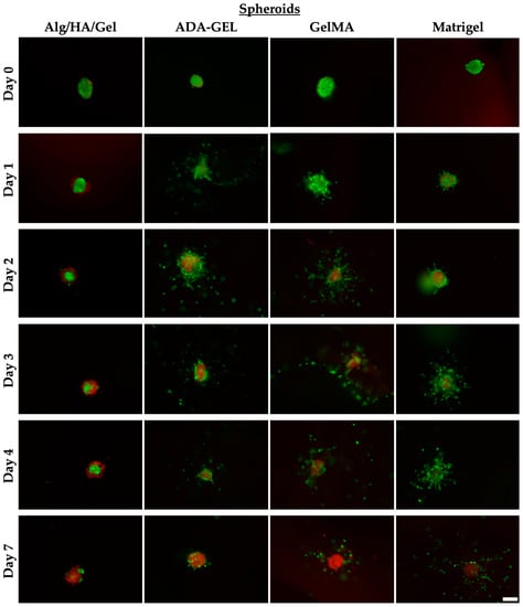 Spheroids on days 0, 1, 2, 3, 4, and 7 embedded in Alg/HA/Gel, ADA-GEL, GelMA, and Matrigel. Green = live cells, red = dead cells; 10× magnification. Scale bar = 100 µm.