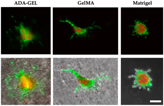 The migration of endothelial cells into the surrounding hydrogel, which is an important step for the formation of new blood vessels during angiogenesis, was further confirmed by the observation of spheroids over 7 days for ADA-GEL and GelMA []. The formation of spheroids allows cells to be packed tightly into a small volume, enhancing cell-cell interaction and thereby mimicking tissue architecture []. The hanging drop method was chosen for the preparation of spheroids because it can be used to produce a small number of spheroids with easily controllable sizes [,]. However, for the spheroids printed in the hydrogels, only a strong migration of cells and not yet the formation of networks could be detected.