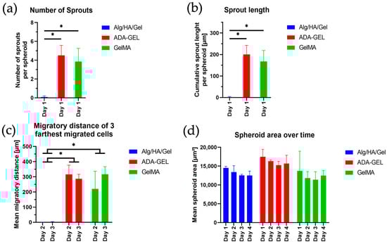 (a) Number of sprouts formed in the hydrogels on day 1, (b) Length of sprouts formed in the gels, (c) Migration distance of the three farthest migrated cells on days 2 and 3, (d) Spheroid area over days 1, 2, 3, and 4. Data represented as mean ± standard deviations. * p < 0.05.