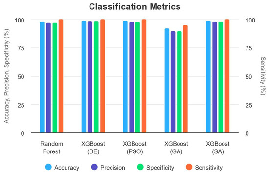 | XGBoost (PSO) | 99.04 | 98.10 | 98.11 | 99.98 |