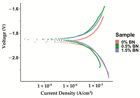 | Mg–1.5%BN | 47.62 ± 1.53 | 288.1 | 72.8 ± 21.1° | −1.85 | 558 |