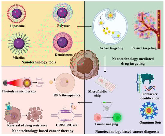 Nanotechnology tools-based cancer targeting diagnosis and treatment. Various types of nanotechnological tools such as liposome, polymers, micelles, and dendrimers are exploited for targeted delivery of drug nanoparticles. The targeting of these nanoparticles may be active or passive. Nanotechnology-based cancer diagnosis is possible by the application of microfluidic chip, identification of biomarkers, nanoscale probe and quantum dots. Cancer treatment is made possible by nanotechnology-based photoinduced gene silencing, RNA mediated cancer nanotherapy, overcoming multidrug resistance and nanotechnology-based CRISPR/Cas9 delivery.