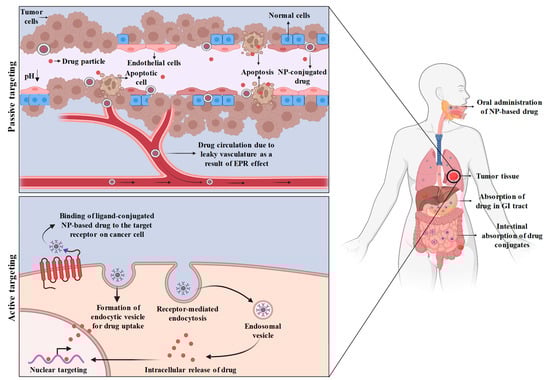 Efficient targeting of cancer cells through nanoparticle-based drug delivery is important for enhanced therapeutic efficacy, reduced dose-limited toxicity, and protection of normal cells from systemic toxicity. Anti-cancer agents should be targeted to the tumor site using nanoparticles in such a way that they reach the tumor tissues while passing through all of the phagocytic barriers with minimal loss of blood activity or volume. Furthermore, the active form of the drug, after being administered intracellularly, should only act on the cancerous cells without affecting normal cells. The interaction between nanomaterials and tumor cells is currently an intensive research topic that aims to delve deeper into the field of nanoparticle-based targeted drug delivery. Mechanisms of drug delivery can be grouped into two types, the first one is driven by non-ligand mediated nanoparticles i.e., passive targeting, while the later one, active targeting is mediated by ligand conjugated nanoformulations (Figure 2).