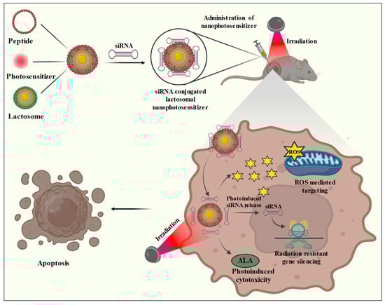 Lactosomal nanophotosensitizer mediated photodynamic treatment. Lactosomal nanophotosensitizer is designed by the incorporation of a polypeptide and photosensitizer conjugated with siRNAs. The lactosomal nanophotosensitizer upon administration is subjected to irradiation due to which the bound siRNAs are released and are responsible for radiation resistance gene silencing. The nanophotosensitizer is also responsible for the generation of ROS which promotes apoptosis. Additionally, phototreatment also induces the overexpression of ALA peptide resulting in ALA-mediated cell cytotoxicity.