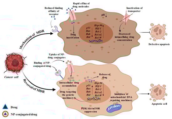 Mechanism of multidrug resistance and its reversal on treatment with NP-drug conjugates. MDR may occur as a result of reduced binding affinity of receptor with the drug. Hyper-activation of efflux transporters also leads to MDR causing rapid efflux of drug which results in reduced drug uptake and hence less intracellular drug accumulation takes place. MDR may also be caused due to defective apoptotic machinery or due to hypoxia which is responsible for overexpression of Hif-1 gene and Hsp90 gene. Other than this, the expression of tumor suppressor gene (p53) and pro-apoptotic genes (Bax, Bak and Bid) is reduced while the expression of anti-apoptotic genes (Bcl-2, Bcl-xL, Bcl-W) is increased. For MDR reversal, drug-loaded NPs are used that have higher binding affinity with receptors on a cancer cell which facilitates rapid uptake of drugs and its increased intracellular accumulation. The drug is afterwards released in the tumor cell due to low pH at the perinuclear surface which prevents the normal cells from system cytotoxicity, thereby resisting MDR. NP-loaded drug targets the genetic machinery and results in inhibition of Hsp90 gene, which further causes suppression of Hif-1 gene. Furthermore, the released drug also enhances the expression of p53, Bax, Bak, Bid and inhibits the action of Bcl-2, Bcl-xL and Bcl-W genes, which induce apoptotic machinery. The drug also targets P13K/Akt/mTOR pathway and mitochondrial DNA repairing machinery, resulting in mitochondrial DNA damage and release of Cyt-c, thereby inducing apoptosis.