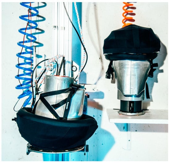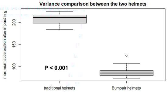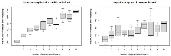 The results show an unequivocal difference between the G values obtained on a Bumpair helmet compared to those obtained on a traditional helmet. There is a ratio of 2.25 minimum on the maximum value of G. The properties of the air involved in the protection of the head here are its capacity for deformation, instantaneous absorption, and the distribution of forces throughout the compressed volume. A traditional helmet uses a small area around the impact to protect the user. The kinetic energy is absorbed by the helmet’s material directly above the impact location []. The impact greatly damages the helmet to the point that is no longer suitable for protective purposes. A Bumpair helmet uses the entire volume of air encased in its bindings to absorb the shock more effectively. This property allows it to redistribute the impact energy over a longer period resulting in a much lower maximal acceleration for the user’s head. This method to withstand the impact does not damage the helmet and allows it to be subjected to impacts more than once [].