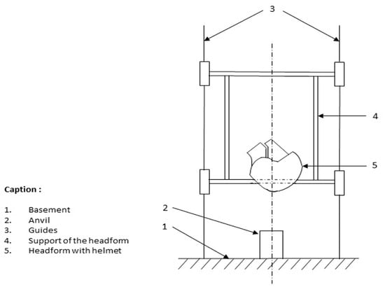 The experimental protocol was based on the EN1078 standard. The impact tests were carried out using certified laboratory-suitable equipment to test the effects on helmets in the event of a fall or collision. All the tests were directed by CRITT, a French laboratory specialized in issuing certificates of compliance with safety requirements. The test benchmark consists of a headform (EN 960 for an M-sized helmet) [] placed above an anvil. A free-falling guide helps the headform to fall straight. An accelerator was embedded into the headform, and the helmet being tested is positioned on top of the accelerator, as represented in Figure 2. The fall speed was set by the EN 1078 standard: 5.42 m/s for a flat anvil. Theoretically, this speed corresponds to a fall height of 1497 mm. This height was adjusted by measuring the speed at 60 mm before the impact point to take into account the various frictions.