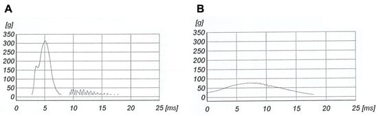 Curves of the acceleration g [m·s−2], measured as a multiple of the Earth’s gravity, and plotted as a function of time [ms] obtained during our experiment. Curves recorded for a traditional helmet (A) and for a Bumpair helmet (B).
