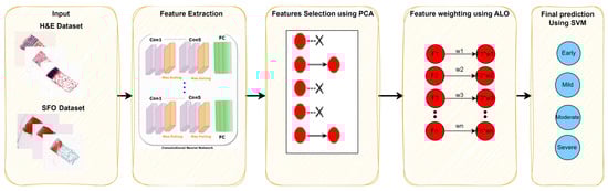 As is clear in Figure 1, the histopathological images passed through various stages: from deep learning structures, the extraction of feature maps, and the employing of PCA to the weighting optimization algorithm. The evaluation criteria are calculated in each stage. The corresponding sections clarify the novelty of the proposed approach.