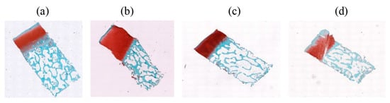 Representative SafO-stained images of cartilage specimens, indicating (a) early, (b) mild, (c) moderate, and (d) severe OA.