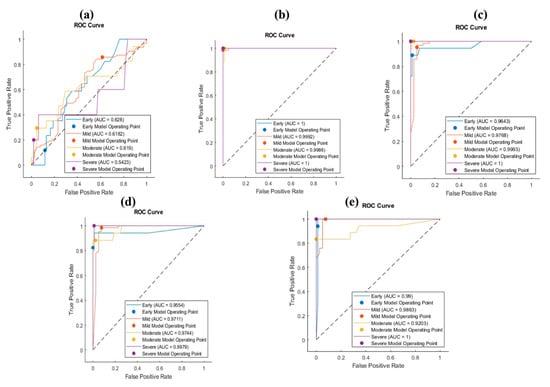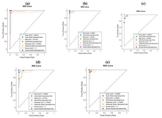 ROC curves of SaFO images for (a) deep DarkNet-19 features with SVM, (b) deep DarkNet-19 features with SVM, (c) deep DarkNet-19 features with SVM (d) deep DarkNet-19 features with SVM, and (e) deep DarkNet-19 features with SVM.