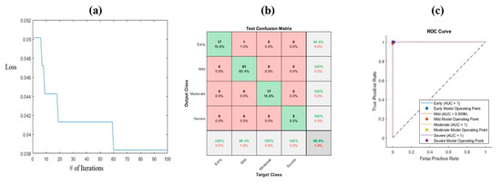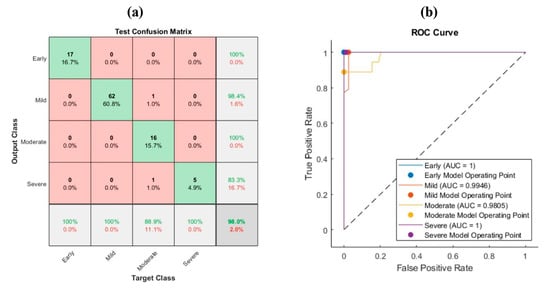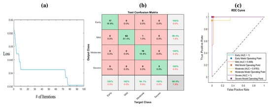 The confusion matrix of the obtained results is described in Figure 8b. The weighting features enhanced the accuracy to 99%. The sensitivity and precision were almost 100% for all the classes, except that the recall was 98.8% for the mild level and 94.4% for the early class. The ROC curve is illustrated in Figure 8c. The area under the curve was 1 for all the classes. The F1 score values were 0.97, 0.991, 1, and 1 for the early, mild, moderate, and severe classes, respectively (Table 4). The specificity values were 98.8%, 100%, 100%, and 100% for the early mild, moderate, and severe classes, respectively. As is clear from Table 4 and Figure 8, ALO has a higher performance than PCA in all the classes.