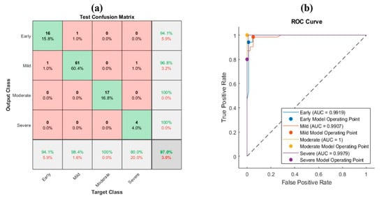 The most significant features did not involve any features from the DarkNet which was expected since the accuracy was low for the DarkNet. Figure 6 and Figure 7 show the confusion matrix of the PCA of all the features from all the convolution neural networks and the corresponding ROC curve for the HE and SafO images, respectively. Figure 6 describes the resultant confusion matrix and its corresponding ROC curve for the HE images. The accuracy was 98% for all the classes. On the other hand, the sensitivity for all the categories was 100%, except for the moderate level, which was 89%. However, the precision was 100% for the early and moderate levels, whereas it was 98.4% and 83.3% for the mild and severe levels, respectively. The AUC was 1 for the early and severe classes. On the other hand, the AUC was 0.995 for the mild class and 0.981 for the severe class. The obtained features using MobileNet performed better than those using the ten features. Therefore, after applying PCA for all the fused features, the most significant were the MobileNet features. They improved the previous results obtained using MobileNet features only.
