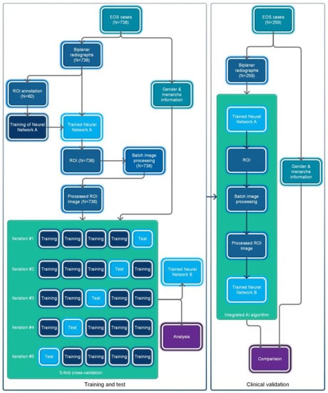Neural Network B is a three-classification network (Figure 3e) that we built using the EfficientNetV2-M framework []. It categorizes pre-menarche females, post-menarche females, and males. EfficientNetV2 introduces techniques like Fused-MBConv and is a well-designed, fast convolutional neural network for image recognition. It offers faster training speed, higher accuracy, and better parameter efficiency compared to previous models []. The ground truth labels were collected based on the actual conditions, while the input consisted of images with biplanar ROIs processed by the image processing module. To evaluate the neural network, we employed a five-fold cross-validation strategy, randomly dividing Dataset A into five mutually exclusive subsets (Table 1). For each iteration, one subset was used as the test set, while the remaining four subsets were merged and used as the training set to train the model. The training parameters were based on the ImageNet21K dataset (https://github.com/google/automl/tree/master/efficientnetv2 accessed on 20 January 2022), and we adopted the AdamW optimizer []. Each iteration involved training for approximately 120 epochs (maximum learning rate: 0.00035, betas: [0.9, 0.999], eps: 1e-6, width: 1.0, depth: 1.0, dropout: 0.3). Subsequently, the trained network was used to test the images in the corresponding test set, and the results were compared against the ground truth.