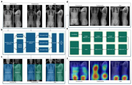 (a) Original EOS images of the three categories. (b) The structure of Neural Network A. (c) Detected frontal regions of interest and corresponding lateral aligned regions. (d) Stitched regions of interest images. (e) The structure of Neural Network B. (f) Class activation maps of the three categories. The regions in closer proximity to the red color represent a progressively more significant role played by those regions in the process of reasoning.