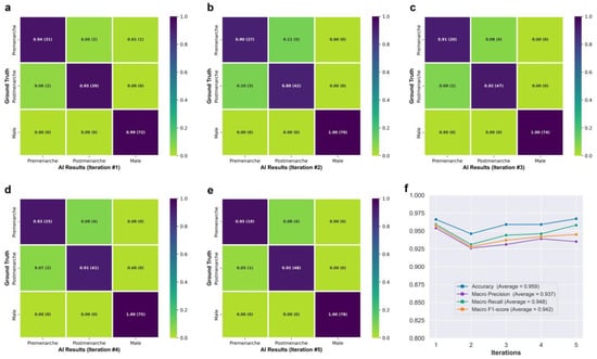 (a–e) Confusion matrices obtained from five iterations of testing. (f) Line graph showing the network’s performance.