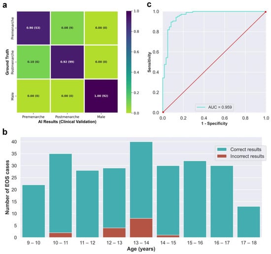 (a) Confusion matrix obtained from testing the integrated AI program on the clinical validation dataset. (b) The correct and incorrect results of the integrated AI program for different age groups. (c) Receiver operating characteristic curve of the integrated AI program for the identification of menarche status in females.