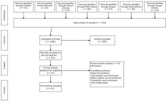 From our search, 1372 citations in all were located. After eliminating duplicates (n = 286), at level 1 we examined 1086 citations. 30 publications were found after two screening steps were completed at level 2: one involved titles and abstracts and the second involved entire articles (Figure 1). Every study was conducted in English and all adult community members who had transfemoral amputations were included. Male respondents made up 78% of the studies’ sample population, and they ranged in age from 21 [32] to 62 [33] years on average. Two research [34,35] used virtual environments, and the sample sizes ranged from n = 1 to n = 20. In 22% of the studies, comparisons with healthy subjects were made.