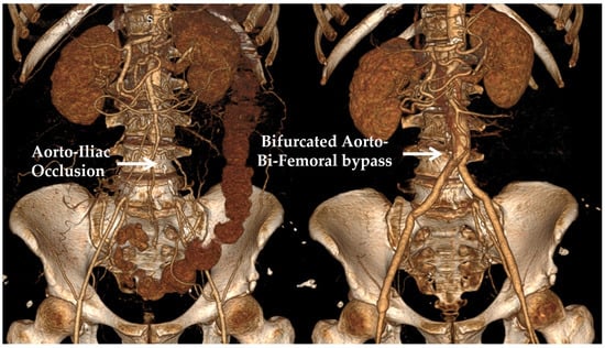 (Left panel): A 3D reconstruction of the pre-operative CT angiography of a patient with aorto-iliac obstruction. (Right panel): The post-operative CT angiography is shown, displaying an aorto-bi-femoral bypass used for treatment.